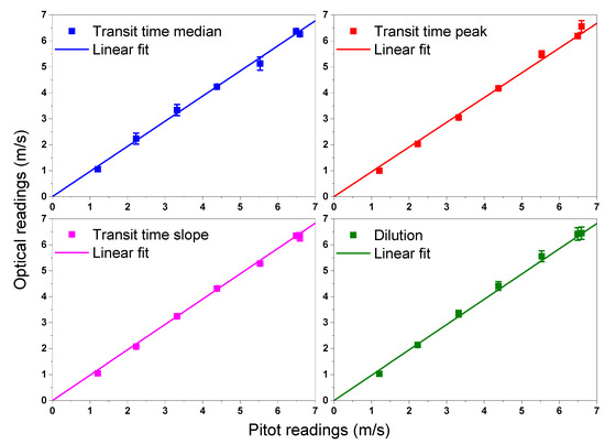 In order to perform dilution measurements, the injection was constant, measured by using a thermal-mass-flowmeter (Bronkhorst High-Tech model EL-FLOW, accuracy 3.5%), at the level of 3.7 ÷ 3.9 L/min ( ms). The concentration readings were in the range 136 ÷ 845 ppm, so well below 1‰, as explained in Section 2. In order to measure the time delay to calculate the velocity, we took the time stamp of the transit of a peak in different ways, described in Section 3.4.1: the median of the distribution of the signal, the peak and the mid-point of the maximum peak slopes. Figure 16 shows the readings of dilution and different time stamps of TT, vs. Pitot readings, for different fan speeds. For TT method each point is the mean value of a set of measurements and the error bars are the corresponding standard deviations. For the dilution method, each point is calculated according to (3), and the error bars are the accuracy of each measurement.