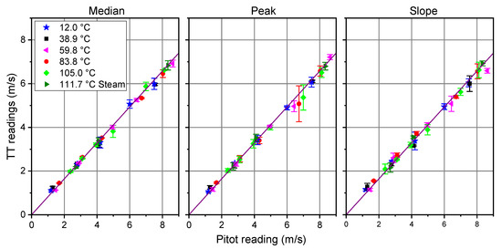 We carried out a second run of measurements, in order to investigate a wider range of experimental conditions, and the use of a conventional Pitot probe, adopted for in-field isokinetic sampling, manually aligned, both vertically and with respect to the duct axis, as routinely performed in real-life periodic measurements. This time the fluid was room air, heated using electric resistors. At the highest temperature, steam was added to room air, at a rate depending on the flow speed. For each temperature, the fan speed was set at different levels. In this set of measurements, the Pitot readings were compared with TT only. The results show very good linearity of the TT readings, at any temperature and gas composition, with respect to Pitot data, whatever the criterion for the time stamp of each peak (Figure 17). On the other side, it is evident that there is a systematic deviation between the TT readings and the Pitot results, whose ratio was measured to be 0.822 ± 0.002. This result is not surprising for a manually aligned probe, according to previous literature, and following our simulations and experimental tests. The amount of the discrepancy is in this case above 20%, which means that the most unfavorable conditions of the positioning of the Pitot probe were encountered here.