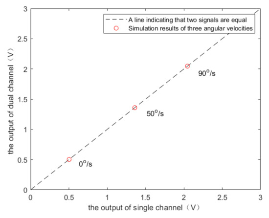 The output angular velocity signal can be obtained after demodulation. In the absence of acoustic interference, the results of single-channel demodulation and dual-channel demodulation are shown in Figure 2. It can be seen from the simulation results that the output signals of the two demodulations are the same. The proposed scheme does not destroy the integrity of the angular velocity signal.