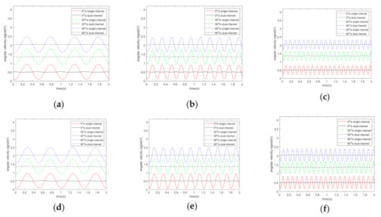 It can be seen from Figure 2 and Figure 3 that when the angular velocity is 0°/s, the demodulation output is not 0 V, which is due to the influence of the non-proportional damping coefficient . At different angular velocities, the peak-to-peak values of output signals of single-channel demodulation and dual-channel demodulation are shown in Figure 4.