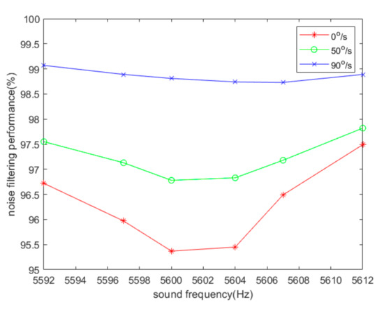 Figure 3 andFigure 4 indicate that sound affects the output of the demodulation, the amplitude and frequency of which depend on the difference between the acoustic frequency and the driving frequency. Figure 4 shows that the angular velocity of the gyroscope does not have a great influence on the acoustic interference. If the sound frequency is closer to the driving frequency, the frequency of the output signal of the single-channel system is lower and the interference is stronger. However, it does not affect the effectiveness of the filtering algorithm. We use to represent the peak-to-peak values of the I channel output signal, to represent the peak-to-peak values of the Q channel output signal, and to represent the peak-to-peak values of the output signal of the algorithm. Then, can be used to represent the noise-filtering performance of the algorithm. Figure 5 illustrates the noise-filtering performance of our algorithm under different acoustic frequencies and different angular velocities.