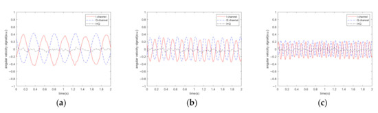 The Q channel demodulation signal is orthogonal to the I channel demodulation and angular velocity signals. The multiplication of the quadrature signal produces a double-frequency quantity, and then the high-frequency component is filtered out through low-pass filtering, which includes the angular velocity signal, i.e., the component caused by non-proportional damping coefficient . Similarly, in the I channel, the component caused by the unequal elastic coefficient is also be removed after low-pass filtering. It can be seen in Equations (3) and (4) that the frequency of the interference signal caused by the sound wave is equal, but the phase difference is 90 degrees, which can be compensated by the Hilbert transform. After the Hilbert transform, the direct current caused by in the Q channel signal is also eliminated. Thus, it can be inferred from Equation (4) that the output signal of the Q channel only contains the interference signal caused by sound. When the acoustic frequency is less than the driving frequency, the Q channel signal is 90° ahead because of the Hilbert transform, and the displacement interference signal can be filtered by adding the two IQ signals. When the acoustic frequency is greater than the driving frequency, the Q channel signal lags by 90° and the displacement interference signal can be filtered by subtracting the two IQ signals. According to the expression of Equations (3) and (4), the IQ dual-channel quadrature demodulation filtering algorithm can ensure the integrity of the angular velocity signal, and also filter out the displacement interference signal.