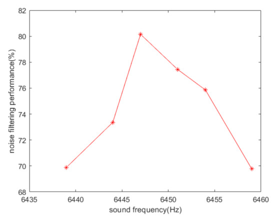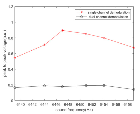 On the basis of the experimental data, the peak-to-peak values of output signals of single-channel and dual-channel demodulations under different sound frequencies are shown in Figure 11. Figure 12 illustrates the noise-filtering performance of our algorithm under different acoustic frequencies.