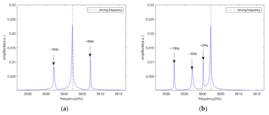 Figure 13 demonstrates the output of I channel and Q channel in the time domain, which shows that the output of Q channel is always 0 without acoustic interference. The angular velocity to be measured in Table 1 was set as the DC value. In reality, the angular velocity information may change with time. We assumed that , in which f = 5 Hz, the angular velocity to be measured is set to 50°/s, the angular velocity signal is an amplitude modulation signal of the bilateral band, as illustrated in Figure 14a, while Figure 14b shows the frequency domain results with acoustic interference of three different frequencies. The three frequencies are, sequentially, 2, 5, and 10 Hz away from the driving frequency. A comparison of Figure 14a with 14b shows that it is difficult for the sound signal to achieve the form in Figure 14a. In the case of acoustic interference, if the sound signal is a power spectrum with a continuous frequency variation within a given range, the proposed scheme can still suppress the side-band noise caused by sound. Under the triple-frequency acoustic attack shown in Figure 14b, the output of the single-channel and dual-channel demodulation schemes are shown in Figure 15. In order to provide a better comparison between the true angular velocity signal and the output of the algorithm, the direct current caused by the non-proportional damping coefficient was removed in the simulation. It can be seen intuitively that the noise-suppression performance of the scheme was maintained.