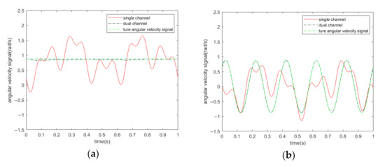Output results of single-channel and dual-channel demodulations under acoustic interference of three different frequencies. (a) Unchanged angular velocity signal; (b) Angular velocity signal with an angular frequency of 5 Hz.