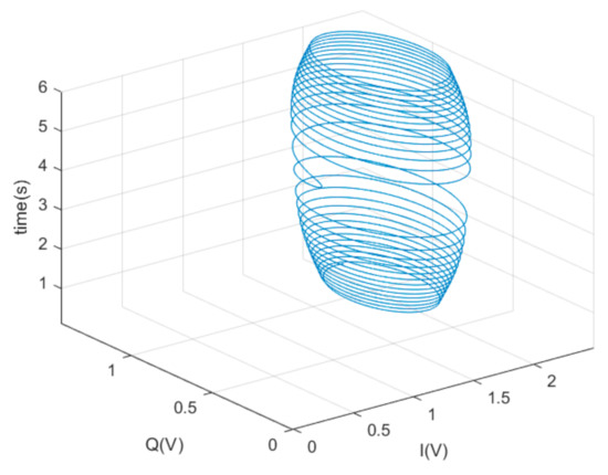 It can be seen in Figure 17 that when the acoustic frequency reaches the driving frequency, the radius of the helix reaches the maximum value. At the same time, from the time axis, the demodulated signal frequency of I channel and Q channel is 0 Hz, and therefore it does not form a helix, but a straight line. The specific position of the straight line in space is determined by the phase difference between the sound and driving signals, as shown in Figure 18. The output of the I channel is maximal when the sound and driving signals have the same frequency and phase, while the minimum output is obtained when the phase difference is 180 degrees.