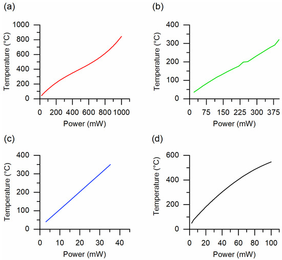 The operating temperature versus applied power calibration curves of substrates used in the fabrication of gas sensors at SENSOR lab: (a) alumina, (b) Kapton HN, (c) micro-hotplate manufactured by SAMLAB and (d) micro-hotplate E1 20:20, manufactured by AMS Sensor Solutions Germany GmbH.