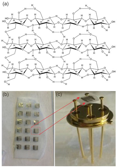 (a) Glucose polymer chains showing H bonds interaction [27], (b) ZnO film deposited on the bacterial cellulose (BC) with the interdigitated electrodes over the oxide material surface, (c) a ZnO-based sensor obtained on the BC and mounted on a case (TO39 package from Schott Electronic Packaging Asia Pte. Ltd.) by gold wires.