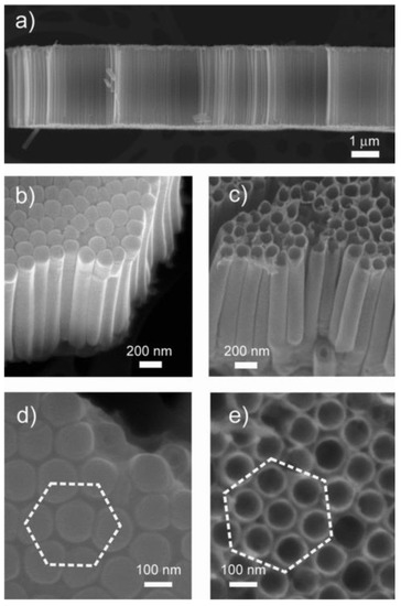 SEM images of TiO2 nanotubes at different magnifications. (a) The self-standing nanotube array after detachment from the substrate highlights the perfect alignment of the tubes. Lateral views from (b) the bottom and (c) the top. As is typically expected in anodization processes, the tubes are closed at the bottom. Plane view of (d) the bottom and (e) the top of the nanotube array. The short-range ordered, close-packed hexagonal assembly can be clearly distinguished. Reproduced with permission from [16].