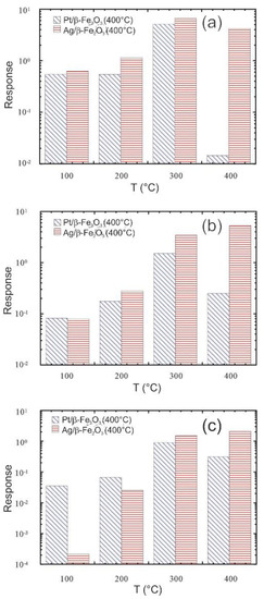 Responses of Ag/β ‒Fe2O3 and Pt/β ‒Fe2O3 samples at different working temperatures to: (a) H2, 5000 ppm, (b) ethanol (CH3CH2OH), 500 ppm, (c) acetone CH3COCH3, 100 ppm. Reproduced with permission from [69].