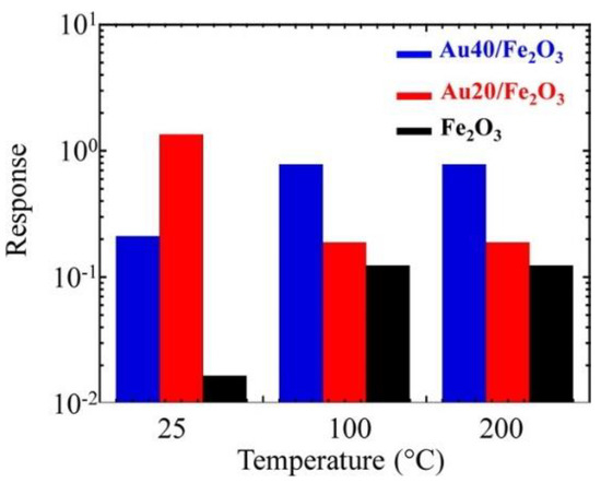 Response to 5 ppm of NO2 as a function of the sensor working temperature for ε‒Fe2O3 and Au/ε‒Fe2O3 nanocomposites with different gold contents. Reproduced with permission from [70].