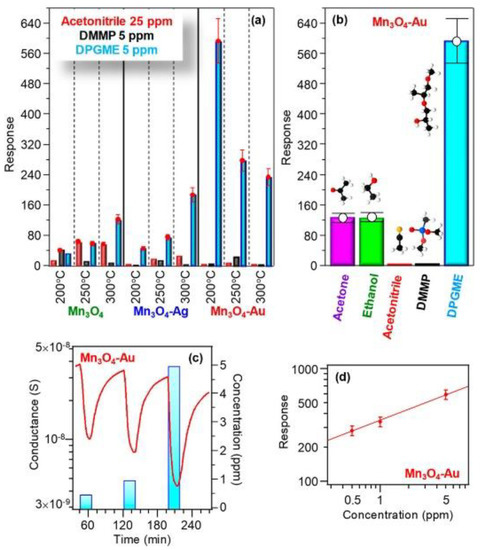 (a) Responses of Mn3O4, Mn3O4−Ag, and Mn3O4−Au sensors to selected concentrations of various chemical warfare agents (CWAs) at different operating temperatures. (b) Responses at 200 °C of Mn3O4−Au to various analytes (acetone, 100 ppm; ethanol, 50 ppm; acetonitrile, 25 ppm; dimethyl methyl phosphonate (DMMP), 5 ppm; di(propylene glycol) monomethyl ether (DPGME), 5 ppm). Dynamic response to DPGME (c) and response vs. DPGME concentration (d) for Mn3O4− Au at 200 °C. Reproduced with permission [71].