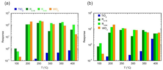 (a) Response of the indicated sensors to 100 ppm of acetone as a function of the operating temperature (Reproduced with permission [80]). (b) Response to 100 ppm of ethanol as a function of the operating temperature for the indicated sensors (Reproduced with permission [81]).