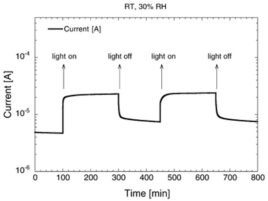 Current flowing in a SnO2 layer in dark and under UV illumination pulses, at RT and 30% of relative humidity. Reproduced with permission [93].