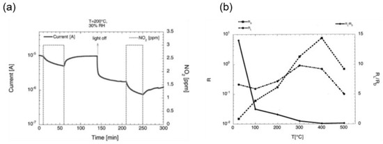 (a) Dynamic current measurements of the SnO2 layer in presence of 3 ppm NO2, with and without UV exposure, at a working temperature of 200°C and 30% of relative humidity. Reproduced with permission [93]. (b) Response in dark- and UV-irradiation condition for the tin-oxide RGTO (rheotaxial growth thermal oxidation) samples gold-catalyzed as a function of the working temperature toward 100 ppm of CO at 30% of relative humidity. Reproduced with permission [94].
