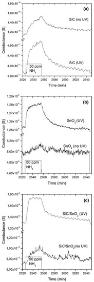 Dynamic responses of (a) pristine SiC foam, (b) pristine SnO2, and (c) SiC/SnO2 to 50 ppm of NH3 at room temperature (RT) under 30% humid airflow, with and without UV activation. Reproduced with permission [95].