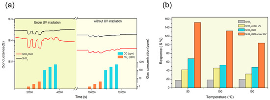 (a) Dynamic response of SnO2, SnO2/rGO composite toward NO2 (1, 2. 5, 4 ppm), CO (100, 250, 500 ppm) at 50 °C and relative humidity (RH) = 40%. (b) Sensor responses toward NO2 (4 ppm) in different working temperature and RH = 40%. Reproduced with permission [96].