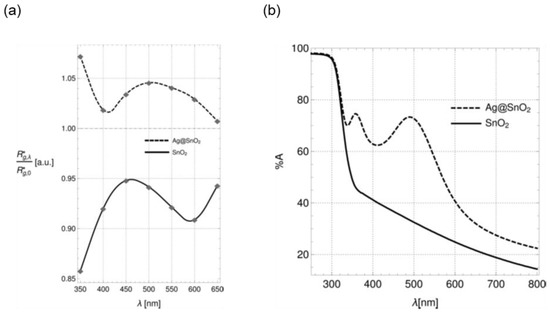 (a) Enhancement factor as a function of wavelength. A value > 1 corresponds to an actual light-induced enhancement, whereas a value < 1 means a light-induced quenching. (b) UV−vis spectra of bare and Ag-decorated SnO2 nanowires. Reproduced with permission [98].