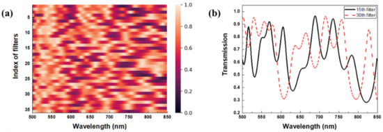 Figure 1 shows the heatmap for the transmission spectra of the reference filters and two selected transmission spectra. In Figure 1a, each of the transmission spectra shows a unique sensing pattern because of the iterative modeling process of the reference filters based on mutual coherence. Figure 1b shows two transmission spectra that correspond to the 15th and 30th rows in the heatmap of reference filters. The transmission spectrum reveals a deep spectral modulation depth and various features such as broadband backgrounds, multiple peaks with a small full width at half maximums (FWHMs), and irregular fluctuations.