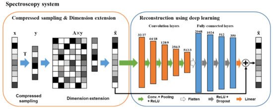 Our goal is to overcome the limitations of the sparse recovery in CS spectroscopy and recover various kinds of spectra using ResCNN. Figure 2 shows the schematic of the CS spectroscopy system using ResCNN. This system consists of two parts: compressive sampling and dimension extension, and the reconstruction using ResCNN. In the compressive sampling and dimension extension, the measurement vector y is obtained from Equation (1), which then transforms into using a linear transformation. A transform matrix extends the M dimension of y to N dimension of , where is a representative spectrum corresponding to . We used as the input for the reconstruction. ResCNN learnt a non-linear mapping between and , and afforded a reconstructed spectrum . The dimension extension by the transform matrix was used to make it easier for ResCNN to extract features and reconstruct spectra from the non-linear mapping.