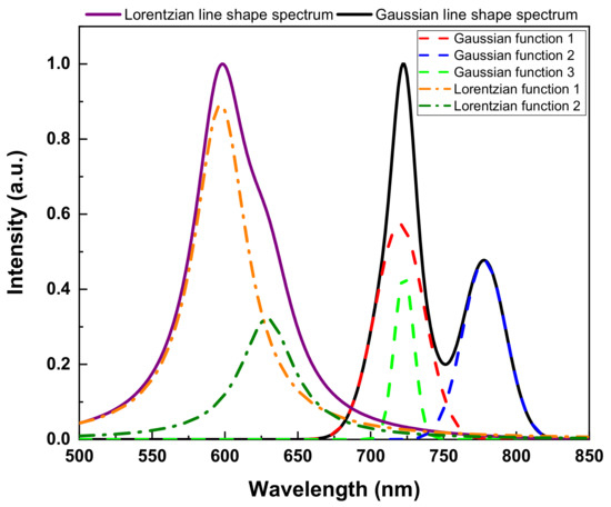 To evaluate the performance of ResCNN, we used two synthetic spectral datasets and two measured spectral datasets. The first synthetic dataset is composed of Gaussian distribution functions while the other is composed of Lorentzian distribution functions. These two synthetic datasets were selected as generally these types of functions are used to represent spectral line shapes. As shown in Figure 4, component functions are added to produce the spectra. We generated 12,000 spectra for each dataset. For each spectrum, the number of component functions was generated using a geometric distribution with the probability parameter p set to 0.3. We added one to the number of component functions to prevent the number of component functions from becoming zero. Then, we randomly set a location, a height, and an FWHM of each peak. To set a peak location (nm), an integer number was randomly selected from a uniform distribution with the interval (500, 849). A random number from a uniform distribution in the interval (0, 1) was used for the height. An integer number for an FWHM (nm) was randomly drawn from a uniform distribution with the interval (2, 50). Finally, all of the component functions were summed to generate the spectrum. The height of each generated spectrum was normalized such that it was mapped from zero to one.