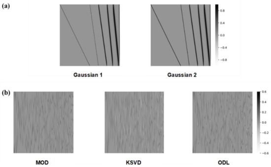 where is a regularization parameter and is ith sparse signal over the training dataset. By fixing an initial guess for the dictionary in Equation (5), we obtain a solution for the sparse signals . The dictionary is then updated by solving Equation (5) using the sparse signals obtained. This process is iteratively repeated until convergence is reached and we derive the learned dictionary. We used three dictionary learning methods: method of optimal directions (MOD) [36], K-SVD [37], and online dictionary learning (ODL) [38]. The learned dictionaries are generated for each of the training datasets, and the reconstruction performances are evaluated for each test dataset. Figure 5b shows learned dictionaries identified using the Gaussian training dataset. The learned dictionaries clearly depend on the dictionary-learning methods used. Nevertheless, each column of the dictionaries shows a learned spectral feature from the training dataset.