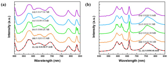 Spectral reconstructions of test spectra in measured datasets: (a) spectrum of organic compound dibenzothiophene in USGS dataset, (b) spectrum of Munsell color 5PB 2/2. The input spectrum (solid red line (i)) is compared with ResCNN (dashed black (ii)), CNN (orange (iii)), sparse recovery: Gaussian 1 (green (iv)), Gaussian 2 (blue (v)), and K-SVD (purple (vi)). The baselines are shifted for clarity.
