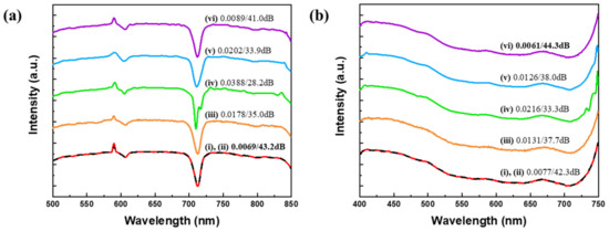 To date, for effective signal recovery in CS spectroscopy, three requirements should be satisfied. First, the spectrum should be a sparse signal or capable of sparse representation on a certain basis. Second, the sensing patterns of optical structures should be designed to have a small mutual coherence [6]. Third, appropriate reconstruction algorithms are required. Note that several sparsifying bases have been used in CS spectroscopy such as a family of orthogonal Daubechies wavelets [7], a Gaussian line shape matrix [8,9], and a learned dictionary [10]. Furthermore, numerous optical structures have been proposed to attain the necessary small mutual coherence for sensing patterns such as thin-film filters [11,12], a liquid crystal phase retarder [13], Fabry–Perot filters [7,14], and photonic crystal slabs [15,16]. As algorithms for reconstructing the original signal, two types of basic reconstruction techniques have been developed: greedy iterative algorithms [17,18] and convex relaxation [19,20]. In CS spectroscopy, the reconstruction algorithms have been used with a sparsity constraint. Additionally, a non-negativity constraint is used in Reference [16,21]. Combining these three considerations, CS spectrometers have shown stable performance for light-emitting diodes (LEDs) and monochromatic lights.