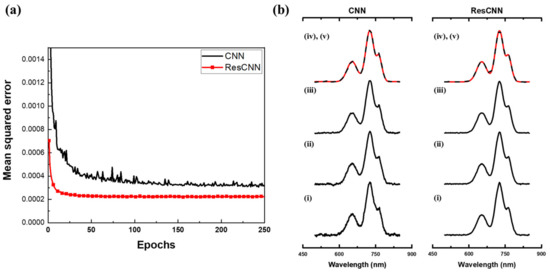 The reconstruction of an example spectrum with respect to the number of epochs is shown in Figure 8b. Black lines ((i) to (iv)) are the reconstructed spectra at 1, 50, 150, and 250 epochs, respectively. The solid red line (v) is the original spectrum, and the series of reconstructed spectrum for ResCNN show that the reconstruction converged earlier than CNN. The increased rate of convergence is because of the residual connection in ResCNN. Overall, the reconstruction performance of ResCNN is an improvement over CNN.