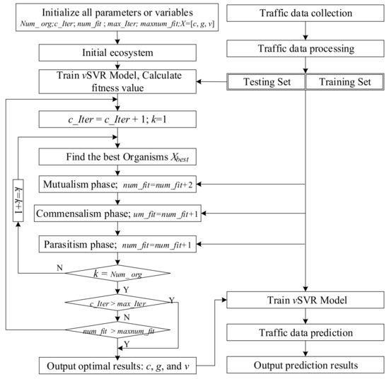The flowchart of symbiotic organisms search (SOS) optimized support vector regression (vSVR).