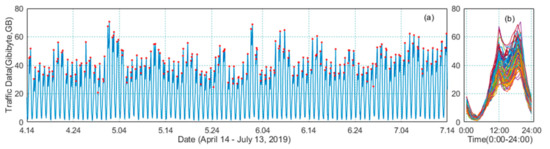 In Figure 2, the data collection granularity is 1 h, that is, 24 times per day. It could be seen from the figure that the daily traffic flow trend is similar (the peak value is usually the data collected at 12:00 or 20:00). However, the daily peak values vary greatly, and the festivals’ traffic peaks were significantly higher than the non-holiday traffic peaks. Among the obtained traffic data, the maximum daily traffic peak was on May 1 (holiday), which was 70.67 GB, while the minimum daily peak value was on May 22 (Wednesday, weekday), which was 35.11 GB.