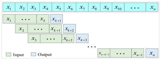 In Figure 3, n and k are the length of time series and the length of flow data of theinput prediction model, respectively. The model output length is 1. After sequence processing, the input data has n-k samples, that is, the input data dimension is (n−k) *k. In this paper, the data collected were from 14 April to 13 July 2019.24 data were collected each day, so the value of n is 2184.