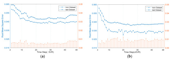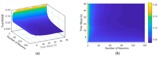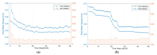 Figure 6a shows the training and test error curves for different time steps when the number of hidden nodes in the ELM was 90, and Figure 6b is the error curve for vBLR. As can be seen from Figure 6, the value of k corresponding to the minimum RMSE of ELM on the test set is 27, while the value of k corresponding to the minimum RMSE of vBLR is 27. The minimum RMSE of the ELM and vBLR on the test set are 0.0426 and 0.0472, respectively.