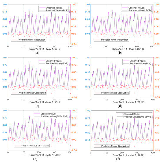 Comparison of predicted and observed values of each regression model on the test set. (a) vBLR. (b) εSVR (c) vSVR. (d) ELM. (e)SOS-εSVR. (f) SOS-vSVR.