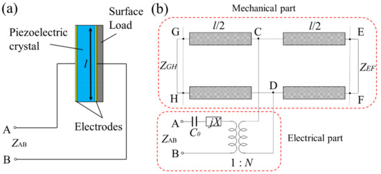 where ZL is the acoustic impedance, ρ is the density, and v is the sound speed. As shown in Equation (1), the elastic modulus depends on the square of the acoustic load impedance. This relation supports the hypothesis that the acoustic impedance can be a sensitive parameter in determining the object’s elastic property. For elasticity sensing, the surface load sensing model studied in the previous work can be used [37,38]. A schematic of the surface load sensing model is shown in Figure 1a. In this model, the piezoelectric crystal with the acoustic loads can be expressed as an equivalent circuit model that has two mechanical ports and one electrical port, as shown in Figure 1b. Thus, the output electrical impedance (ZAB) of the sensor is