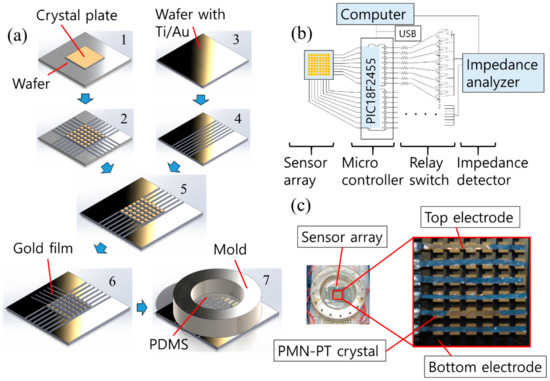 (a) 6 × 6 array fabrication process; (b) the block diagram of the array impedance measurement system and the switch circuit; (c) the fabricated 6 × 6 array with the switch and microcontroller circuits.