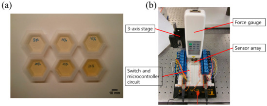 For the test sample material, gelatin powders (Great Lakes Gelatin Company, IL) were used since its elastic stiffness is efficiently controlled by the adjustment of weight ratio (WR) of powder. The test samples were prepared using the traditional fabrication method for tissue-mimicking phantoms which was referred to in published papers [54,55]. Gelatin powders with 5% to 30% WR were blended in the warm water (65 °C). Then, gelatinous samples were degassed in a vacuum chamber and stored in a refrigerator for 3 h. Figure 3a shows the fabricated test samples with different WR. To characterize the sample’s elastic modulus as reference data, the force-deformation method [56] was used. Young’s modulus of each sample can be obtained according to Equation (15):