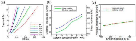 (a) The stress-strain measurement result for test samples with different weight ratios; (b) the measured electrical impedance and shear modulus of as a function of gelatin concentration; (c) the measured and calculated relative electric impedance shift of the bulk crystal. The calculated result was obtained from Equation (4).