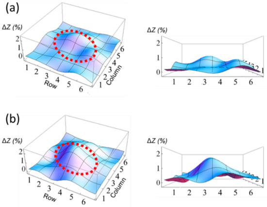 Elasticity sensing test results using the 6 × 6 sensor array for (a) 5% WR gelatin sample and (b) 30% WR gelatin sample. Red dotted circles represent the position of each gelatin sample.