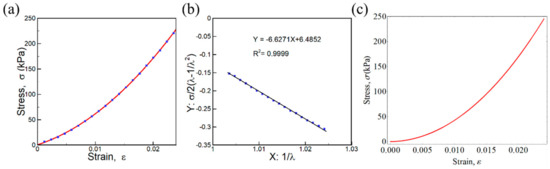 (a) The measured stress-strain diagram of polydimethylsiloxane (PDMS) sensing layer; (b) calculated Mooney–Rivlin plot (σ/λ −1/λ2 verses 1/λ); (c) the calculated stress-strain diagram of PDMS using the third-order Mooney model from Equation (10).