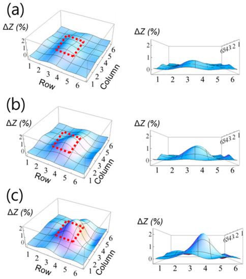 Force-sensing test result using the 6 × 6 sensor array; (a) 2 N (b) 3 N, and (c) 4 N forces were applied. Red dotted squares indicate the area over which forces were applied.