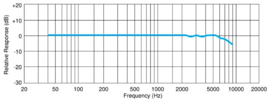 One of the most import elements in a noise measurement system is the microphone, which determines the overall quality of the equipment. In order to build cost-effective solutions, condenser microphones must be avoided due to their high price. The microphone used is an electret Panasonic WM 63-PR [], whose frequency response is shown in Figure 2. The frequency response and dynamic range of the microphone suggest that it can be used to design an instrument with characteristics similar to type 2 sound level meters, according to the IEC 61672 standard [], with a frequency range of 63 HZ to 8 kHz.