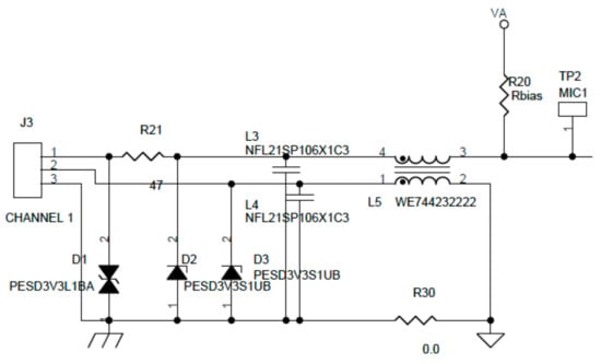 The first block in Figure 1a shows the signal conditioning stage, which is used to adapt the signal from the microphone to the analog to digital converter (ADC). This stage is formed by two active filters. One of them is a high-pass filter with a cutoff frequency of 5 Hz, and the other is a low-pass filter with a cutoff frequency of 22.7 kHz; both feature a unity gain. To adapt the microphone’s signal level to the dynamic input range of the ADC, a gain stage was added. To minimize the noise and protect the equipment against electrostatic discharge (ESD) and electromagnetic interference (EMI), a front end circuit was added between the microphone and the first filter. Figure 3 shows this circuit.