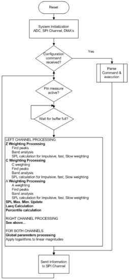 Software for non-time-critical tasks, such as system initialization, commands parsing, and flow control, were implemented in the C language. However, the audio signal processing was coded in assembly language to improve its run time. Figure 5 shows the main flowchart of the code.