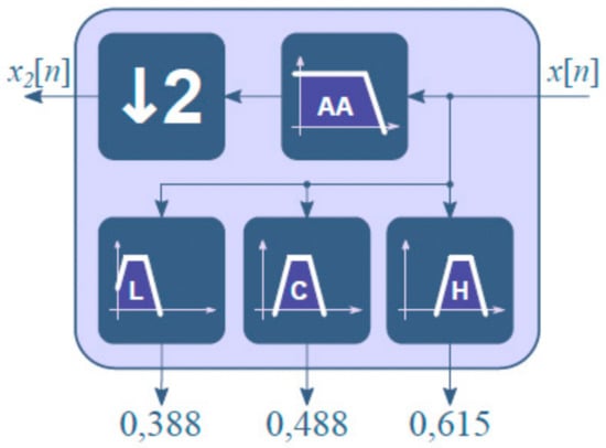 The IEC 61260-1 standard allows two methods for design of the octave and one-third octave filters in base 10 (preferred) and in base 2 (allowed) modes []. For optimization and computational efficiency, the filters were implemented in base 2. A multirate filter structure was used for the design of the third octave filter bank. This allowed us to simplify the design process; instead of designing 30 filters, it was only necessary to design the three corresponding to the octave of greatest frequency, with a central frequency of 16 kHz, in addition to the anti-aliasing filter for the decimator. Figure 6 shows the base block used to build the bank filter. This block consists of a down sampler (by 2), an anti-aliasing filter, and three filters with normalized center frequencies of 0.388, 0.488, and 0.615 [].