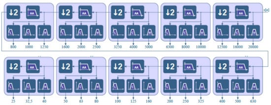 The final frequencies obtained in the real domain have slight differences compared to the nominal values. However, this situation is understood and allowed in the IEC 61260 standards [,,]. Figure 7 shows the complete filter bank that was implemented. This kind of implementation reduces the workload because only four filters are designed. This methodology also has two additional advantages: avoiding the cutoff frequencies to get close to the limit frequency’s minimum and maximum (0 and 32,768 Hz), and reducing the processing power required by the DSP. Due to the successive decimation performed at each stage, the processing load required to compute the whole filter bank is about twice that required to calculate the basic building block shown in Figure 6.