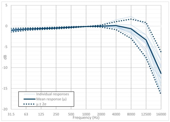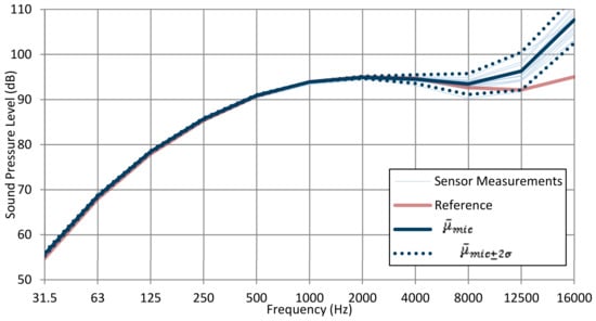 A set of tests was performed using a multifunction acoustic calibrator (B&K 4226) in a calibration laboratory. The use of a multifrequency calibrator allowed us to determine the microphone’s influence on the equipment, thus removing the effects of diffraction and refraction that appear when the microphone is inside an acoustic field. Thirteen different devices were tested, and Figure 8 shows the results obtained. The individual measurements of each of the devices are shown in light blue, and the measurement corresponding to a type 1 reference sound level meter is shown in gray, adjusted to the level offered by the 1 kHz reference microphone. Also, the mean () and the typical deviation with a 95% confidence interval () are shown in solid and dotted dark blue, respectively.