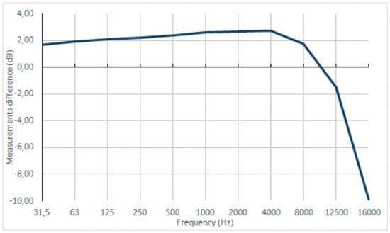 Figure 10 shows the response of the designed equipment in reference to a tone of 1 kHz and a 94 dB sound pressure level, the reference commonly used in the characterization of this type of measurement instrument. At 1 kHz, all frequency responses are about 0 dB, and the variability is visible with respect to the other frequency bands. For this equipment, the variation of the response is reduced (almost flat) to 4 kHz, thereby worsening its frequency response noticeably from 8 kHz.