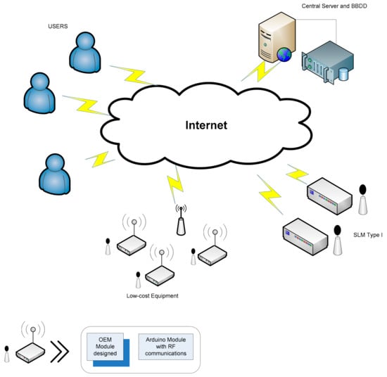 Once it was verified that the equipment offers sufficient quality to measure the noise in cities, the next step was to test the OEM module design in a real environment. The Spanish city of Málaga had optimal conditions to carry out this experiment. Málaga is a modern city concerned about the problem of outdoor noise; it has an operational data monitoring platform with the ability to insert new nodes, and it is possible to access these data to analyze them. For these reasons, eight units were deployed in the city to verify their behavior under real operating conditions over three months. The noise monitoring systems were located on the façades of residential buildings, in areas affected by night-time leisure noise located on pedestrian streets, and near bars, pubs, restaurants, and terraces []. To help to verify the quality of the measurements of these units, the equipment was installed in places where type 1 monitors were available. To keep the power consumption as low as possible, the equipment under study was configured to provide data every minute to reduce the power used for communication. In this way, the equipment used batteries, making the installation process easier. Unlike the network of type I monitors, where the equipment sends data directly to the central server through a general packet radio service (GPRS) connection, the terminals under study send their data via radio (868 MHz) to several access points, which then send the data to the same central server through a GPRS connection. Figure 11 shows the architecture used. The implemented OEM module was connected to a NRG2 panStamp-based CPU, and the code was developed using Arduino. This CPU obtained data from the OEM module and sent it by radio to the access point, which transformed it into frames for the existing architecture.