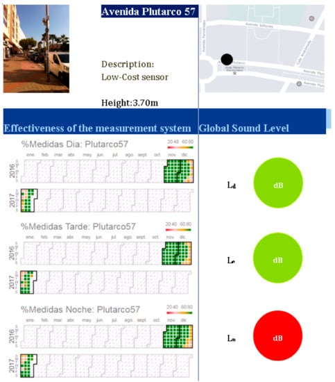 The data from the central server can be remotely consulted and downloaded using a web browser. After three months of the campaign, an exhaustive analysis of the data stored on the central server was performed. The downloaded data were analyzed and a report was made. Figure 12 shows the information for each monitor. The top part shows a view of the equipment installation, along with its localization on the city map. The equivalent noise levels for the day (Ld), evening (Le), and night (Ln) were then calculated. Using a semaphore color code, the obtained noise levels were classified. A figure with a calendar shows the percentage of measurements received for each day. Days that received less than 30% data were deleted for the calculation.